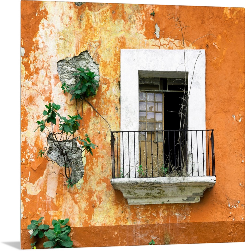 <p>Square photograph of a rustic balcony with orange chipping paint and new plant growth on the exterior wall. From the Viva Mexico Square Collection.</p>
