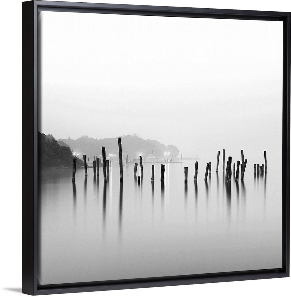 <p>Black and white square image of an old pier in mist.</p>