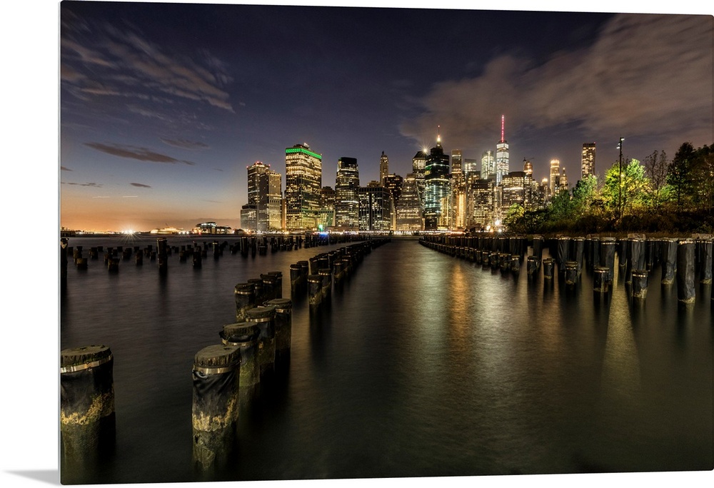 <p>Old pier pylons and Downtown Manhattan, New York City</p>