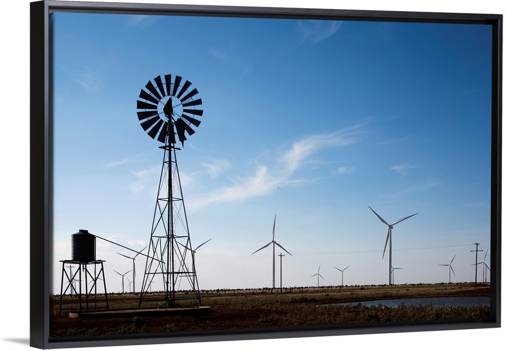 <p>USA, Texas, Vega, Old ranch windmill and water pump beneath array of wind power generating turbines at Wildorado Wind Farm on summer afternoon</p>