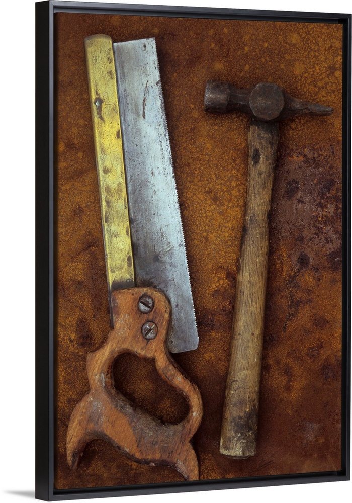 <p>Old well-used tenon saw with wooden handle and brass stiffening bar lying with hammer on rusty metal sheet</p>