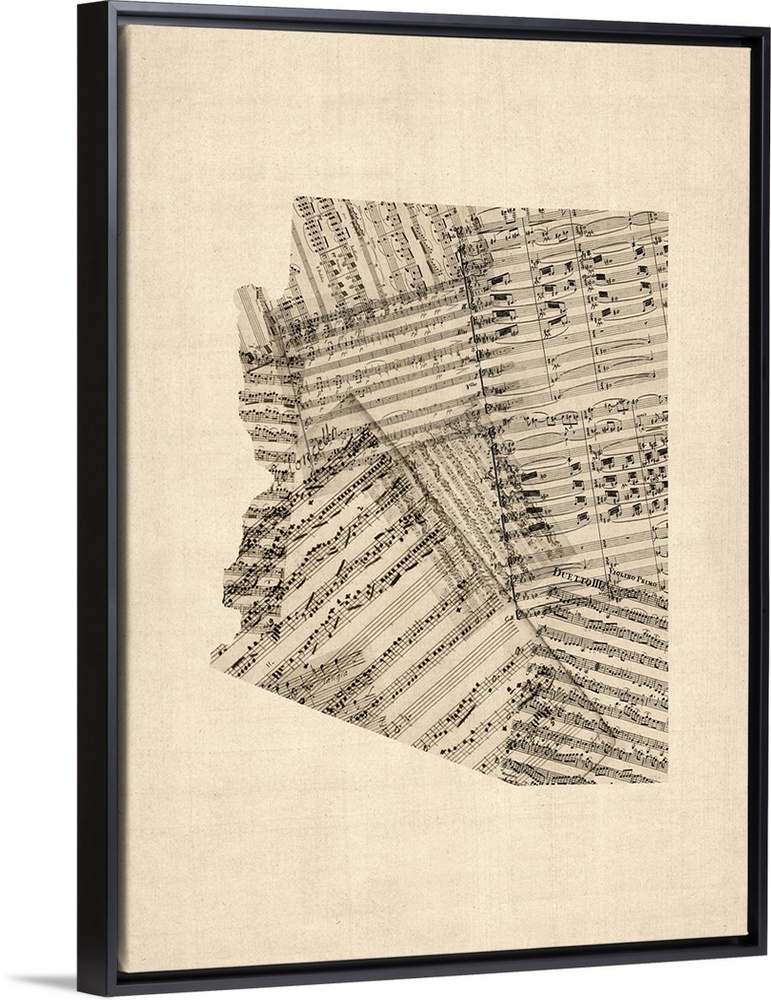 <p>Artistic map of the state Arizona made from distressed sheet music.</p>