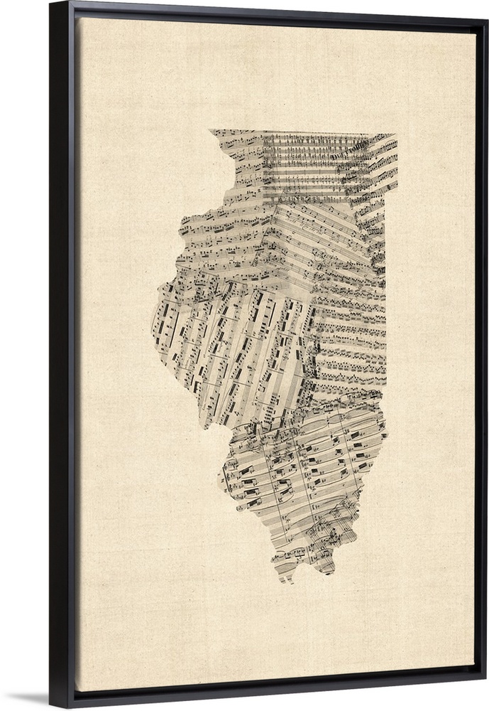 <p>A map of the Illinois, made from a collage of old and vintage sheet music on an antique style background.</p>