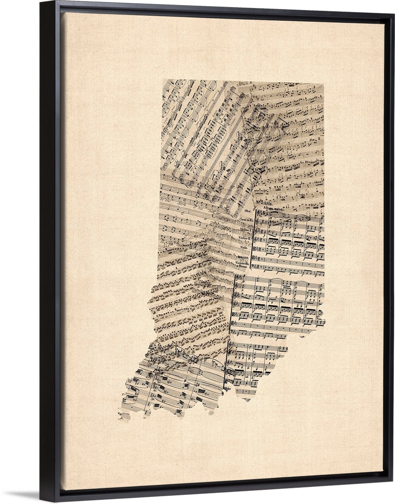 <p>Artistic map of the state Indiana made from distressed sheet music.</p>
