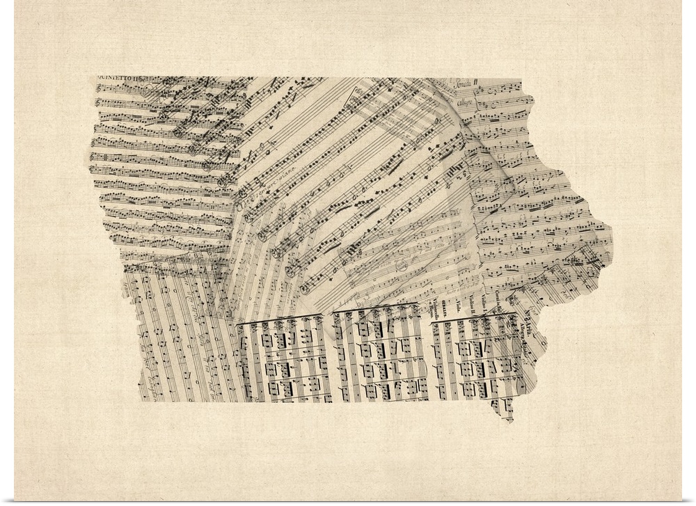 <p>A map of Iowa made from a collage of old and vintage sheet music on an antique style background.</p>