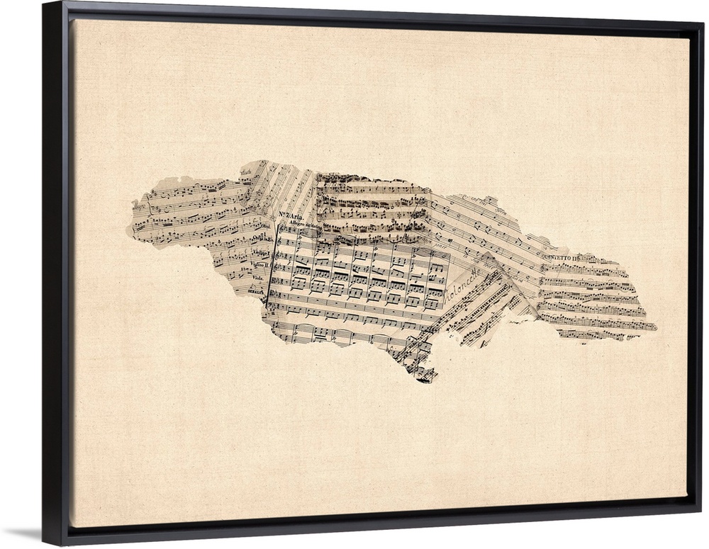 <p>A map of Jamaica made from a collage of old and vintage sheet music on an antique style background.</p>