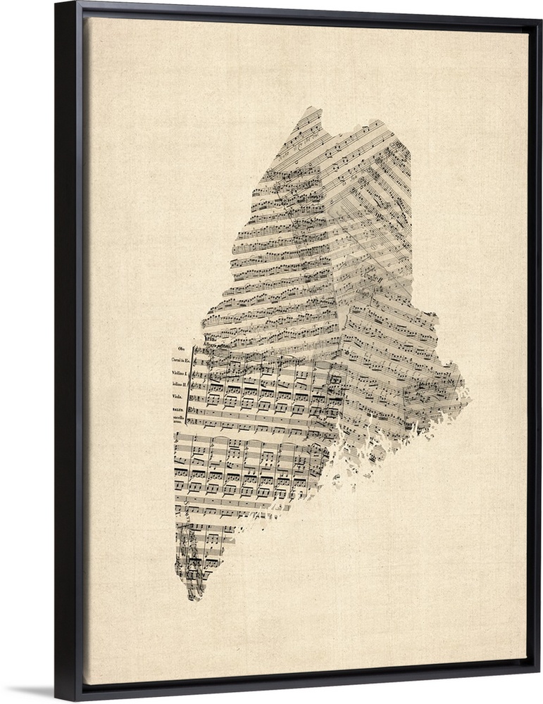 <p>A map of Maine made from a collage of old and vintage sheet music on an antique style background.</p>