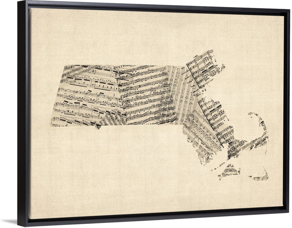 <p>A map of Massachusetts made from a collage of old and vintage sheet music on an antique style background.</p>