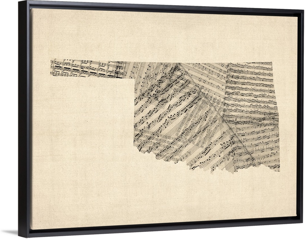 <p>State of Oklahoma made of old sheet music against a weathered beige background.</p>