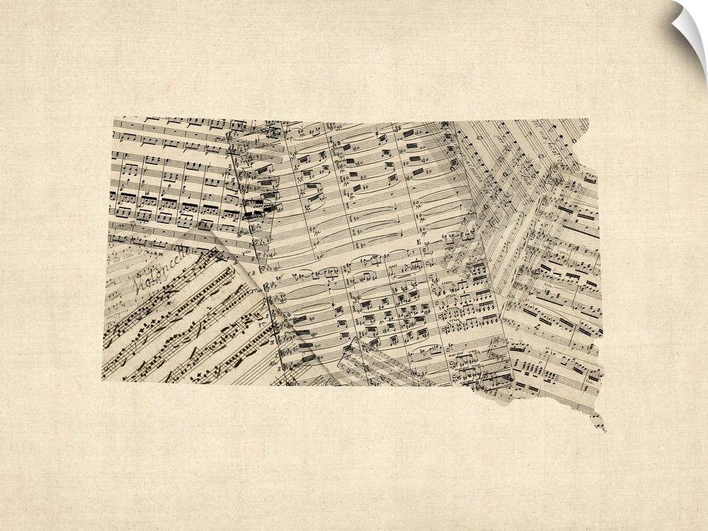 <p>A map of South Dakota made from a collage of old and vintage sheet music on an antique style background.</p>