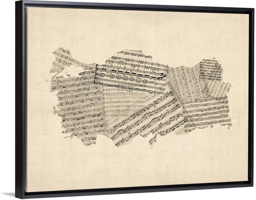 <p>A map of Turkey made from a collage of old and vintage sheet music on an antique style background.</p>