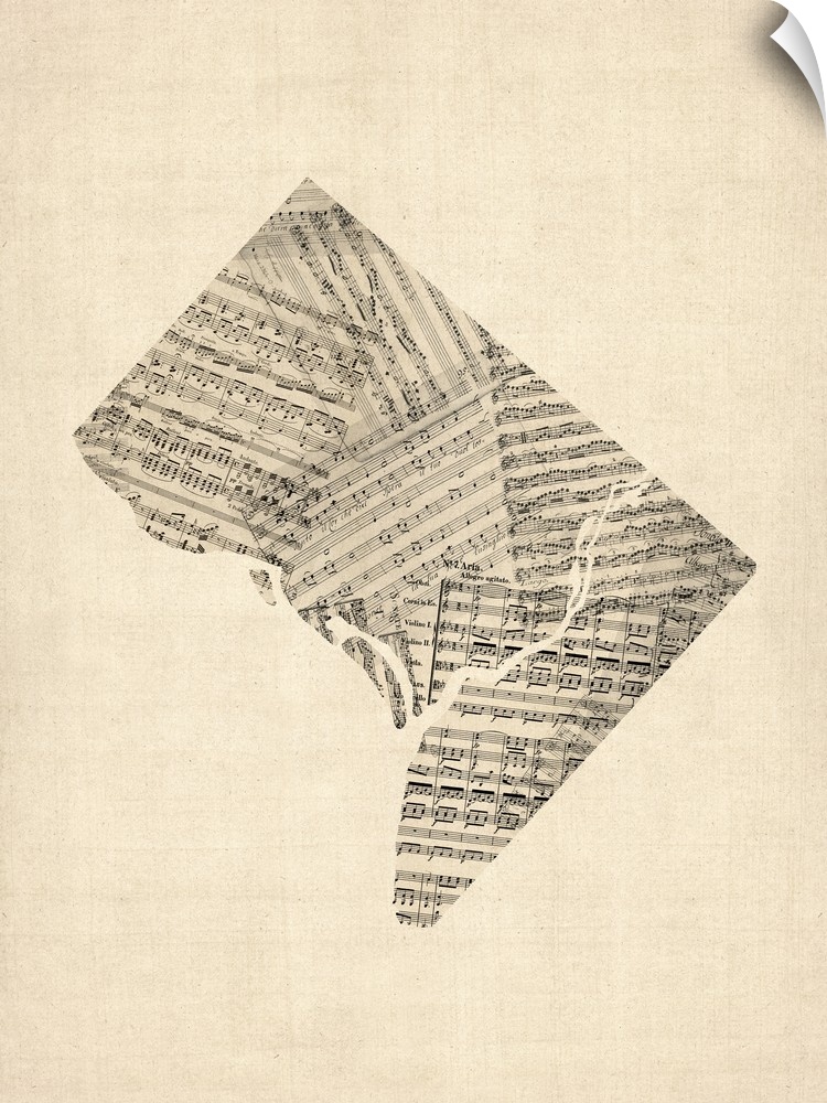 <p>A map of Washington DC made from a collage of old and vintage sheet music on an antique style background.</p>