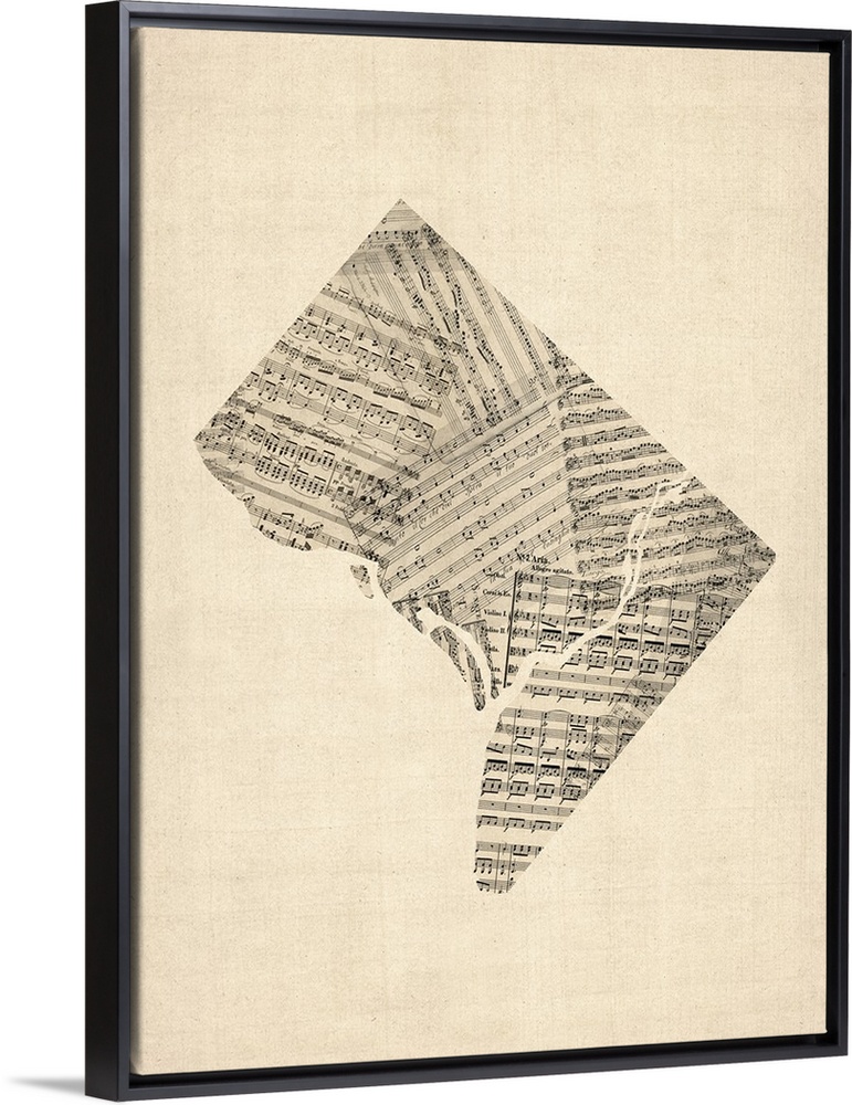 <p>A map of Washington DC made from a collage of old and vintage sheet music on an antique style background.</p>
