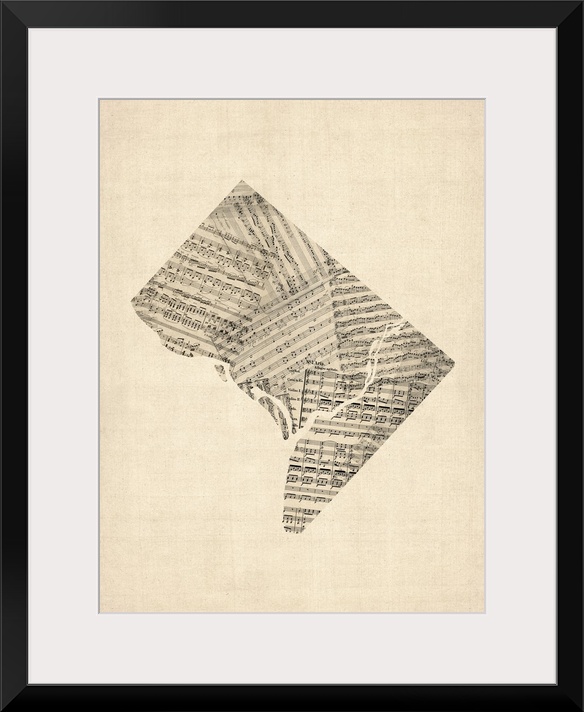 <p>A map of Washington DC made from a collage of old and vintage sheet music on an antique style background.</p>