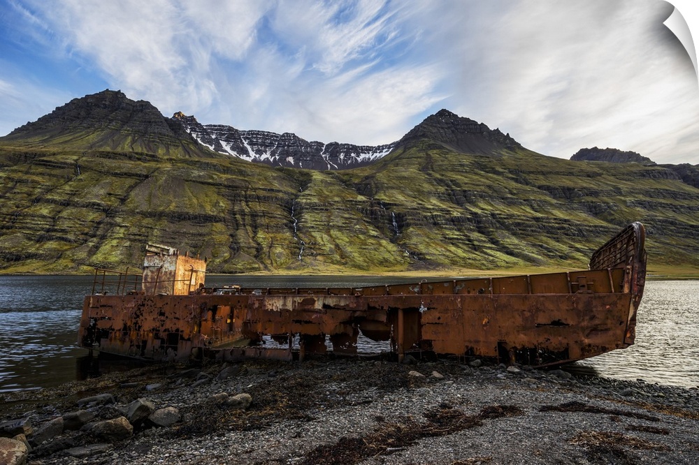 <p>Old Shipwreck Along The Water In Mjoifjordur, East Iceland, Iceland</p>