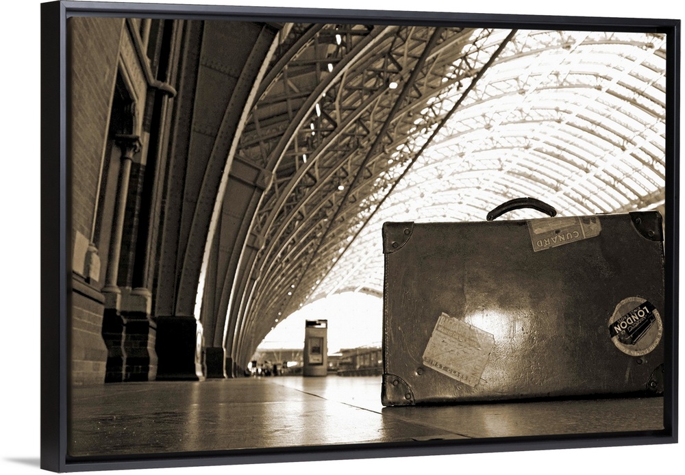 <p>An old, sticker-bedecked suitcase under the Victorian canopy at St Pancras Station, London, England.</p>