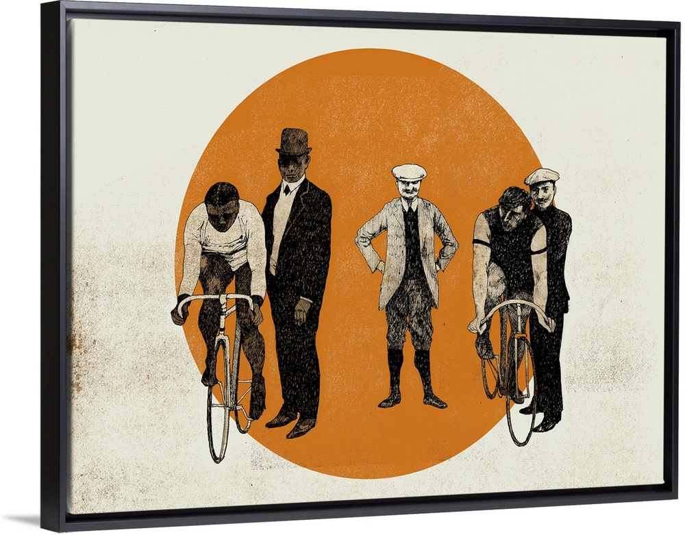 <p>Contemporary illustration of two cyclists ready to start off against a circular orange vignette.</p>