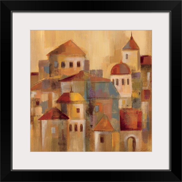 <p>Contemporary painting of village buildings in a faded rustic style.</p>