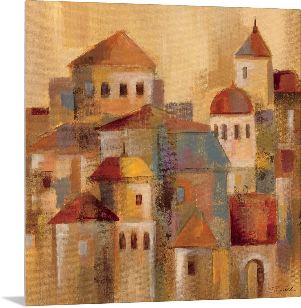 <p>Contemporary painting of village buildings in a faded rustic style.</p>