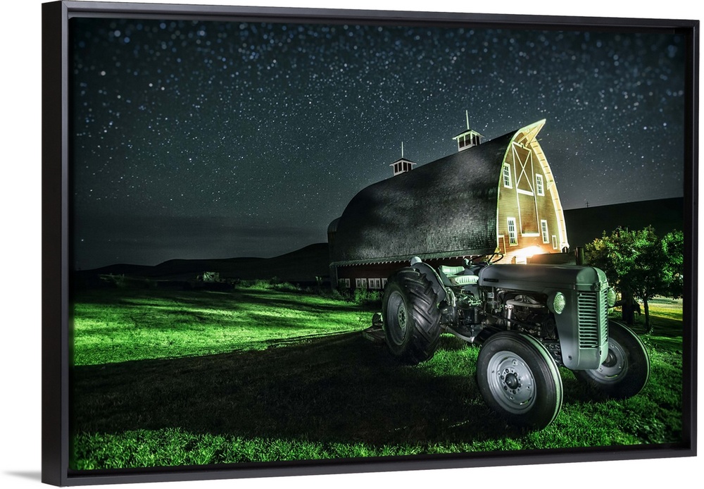 <p>Old tractor and red barn after dark in the Palouse, Washington</p>