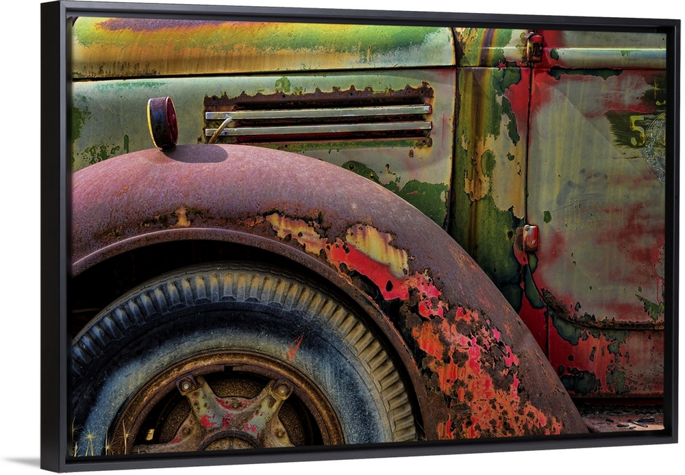 <p>A close up photo of weathered old parts of a vintage truck.</p>