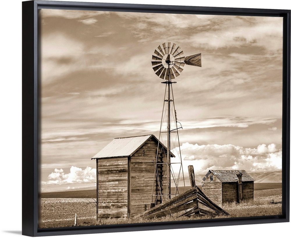 <p>A sepia photograph of a windmill and shed in a field with layers of clouds overhead.</p>