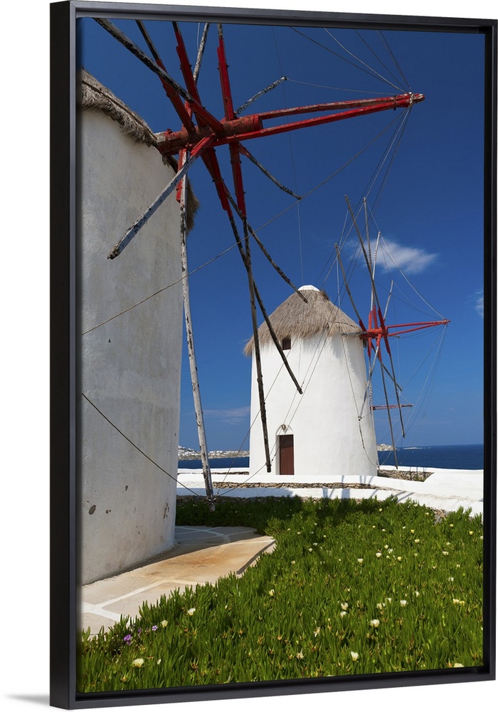<p>Greece, Cyclades Islands, Mykonos, Old windmills at coast</p>