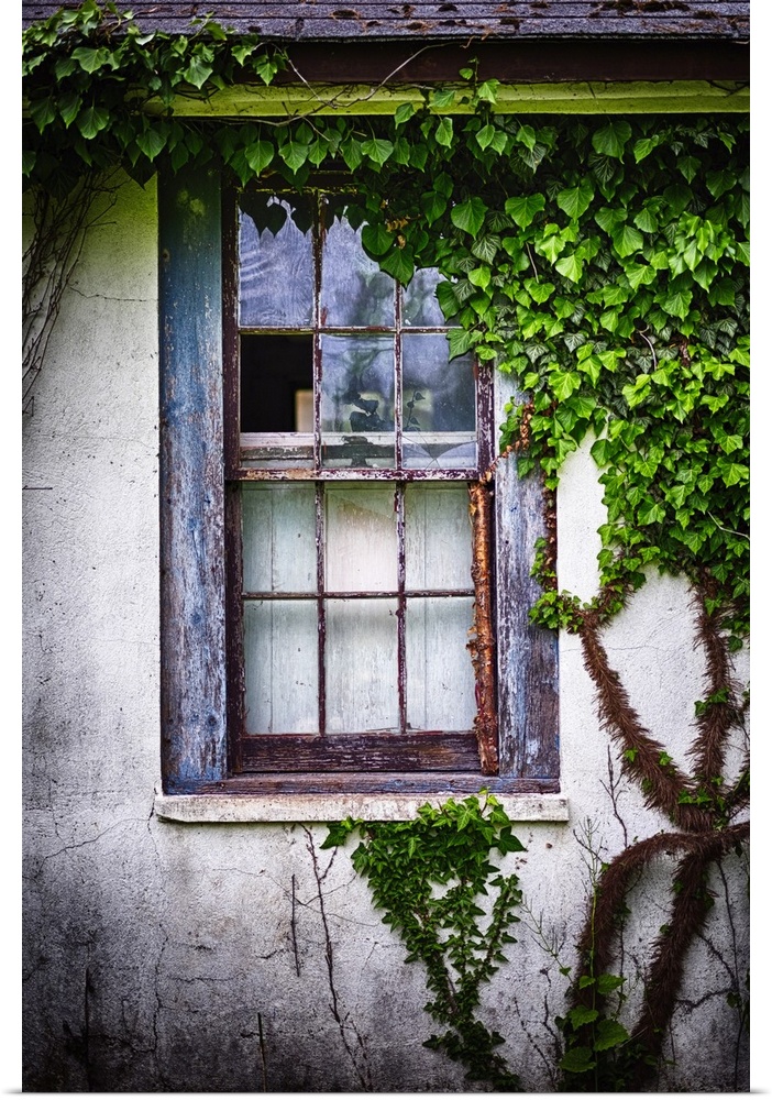 <p>Close Up View of an Olds Weatherworn Window Overgrown With Ivy</p>