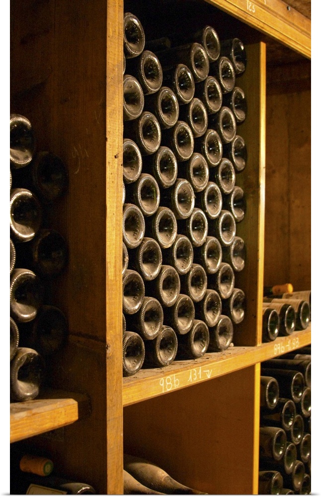 <p>Old wine bottles aging in the wine cellar. Alain Voge, Cornas, Ardeche, Ard..che, France, Europe</p>