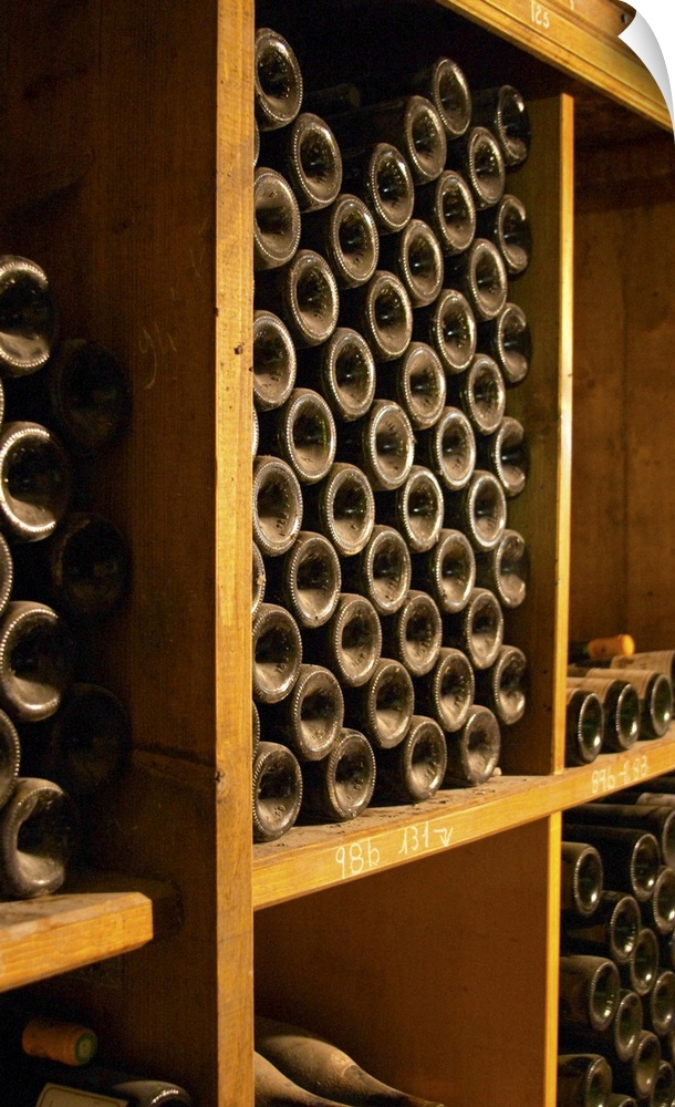 <p>Old wine bottles aging in the wine cellar. Alain Voge, Cornas, Ardeche, Ard..che, France, Europe</p>
