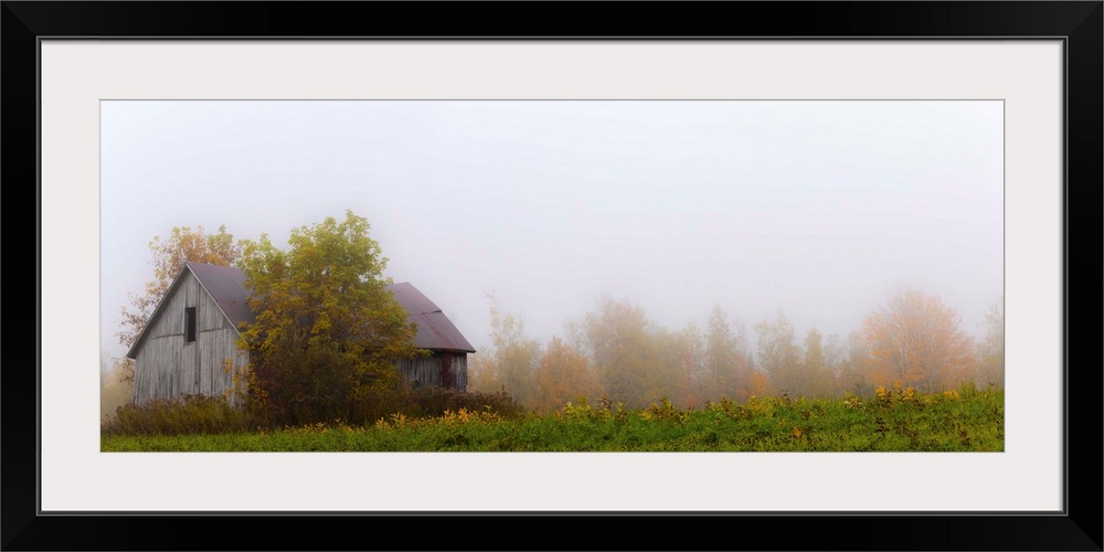 <p>Old wooden barn in a foggy field in autumn; Waterloo, Quebec, Canada</p>