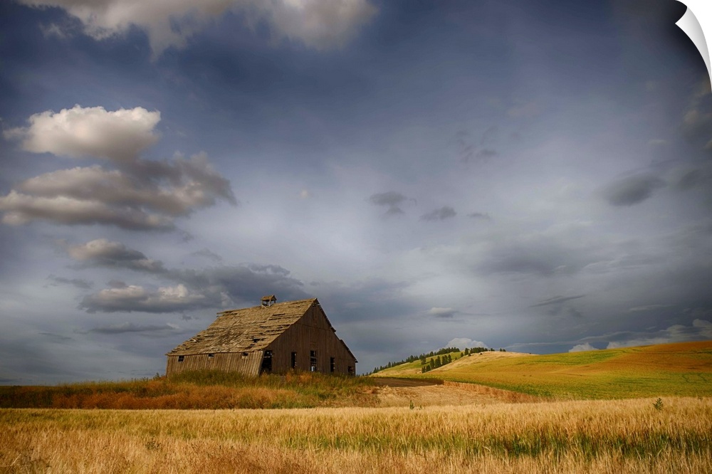 <p>Old wooden barn in a wheat field under a cloudy sky, Palouse, Washington, United States of America.</p>