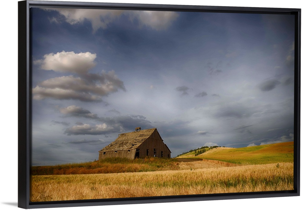 <p>Old wooden barn in a wheat field under a cloudy sky, Palouse, Washington, United States of America.</p>