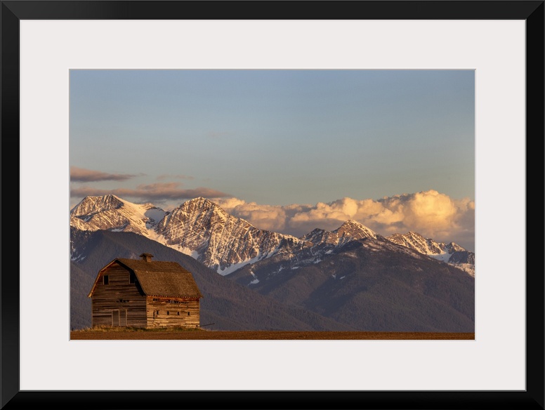 <p>Old wooden barn with Mission Mountains near Pablo, Montana, USA.</p>