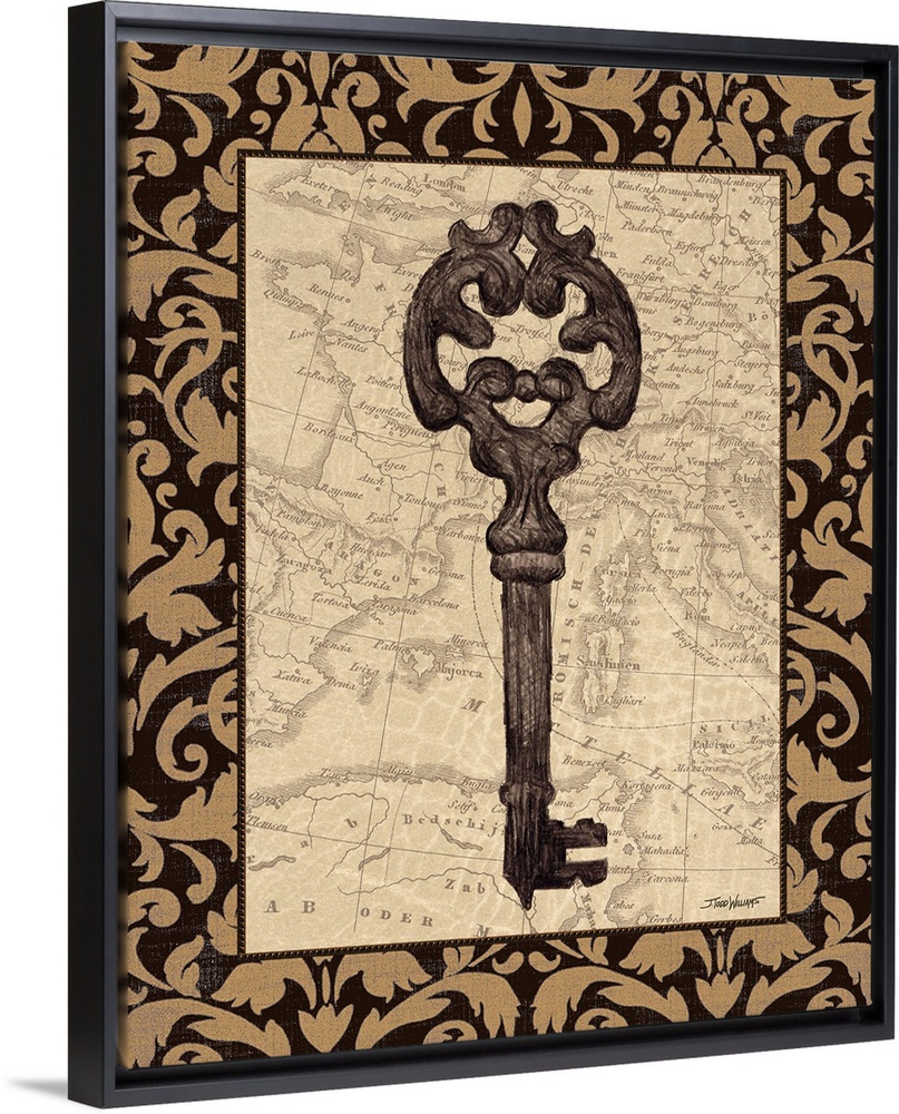 <p>Decor with an illustration of an antique skeleton key with a map in the background.</p>