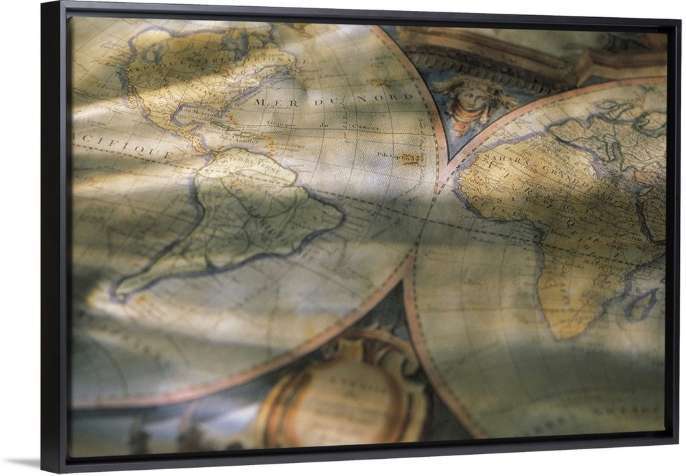 <p>A picture is taken of an antique map of the world that is partially crinkled and sitting in a shaded room.</p>