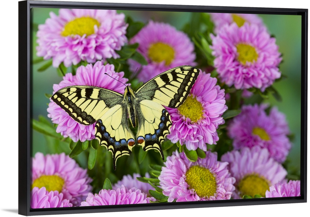 <p>Old world swallowtail butterfly, Papilio machaon, on pink mums.</p>