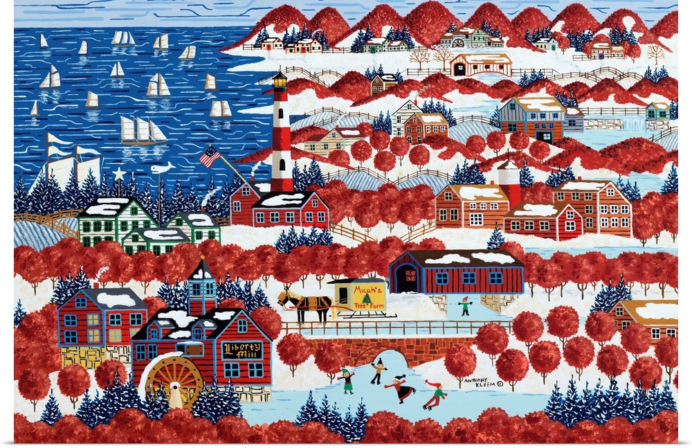 <p>A contemporary Americana painting of a countryside town in winter resembling the American flag.</p>
