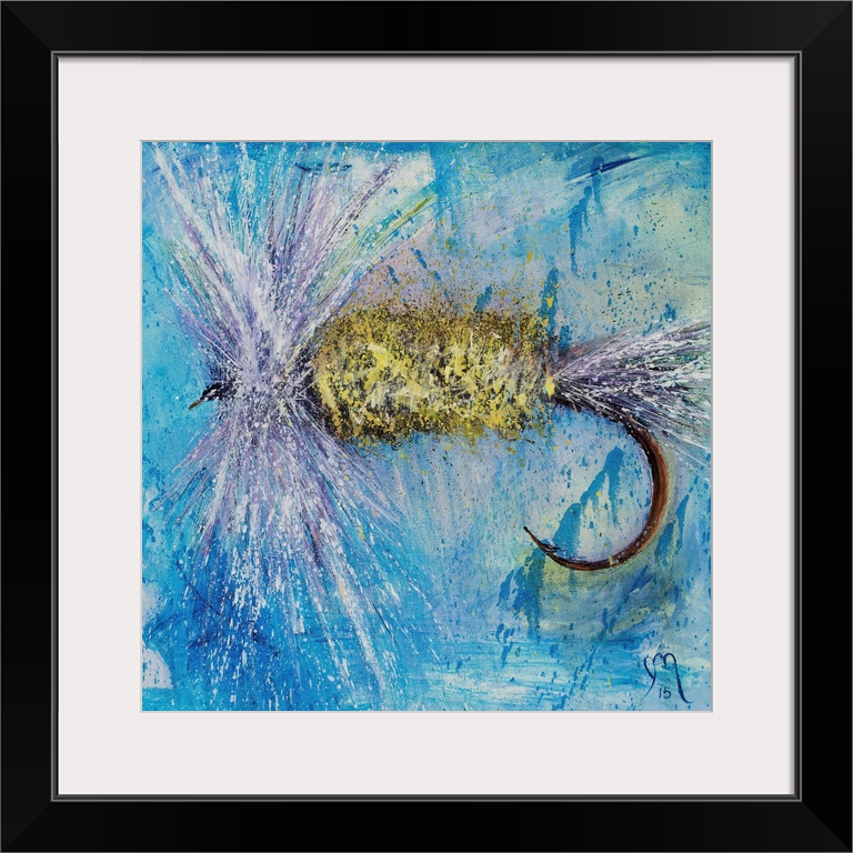 <p>Square painting of a purple, white, and yellow fly fishing lure on a blue and green background.</p>
