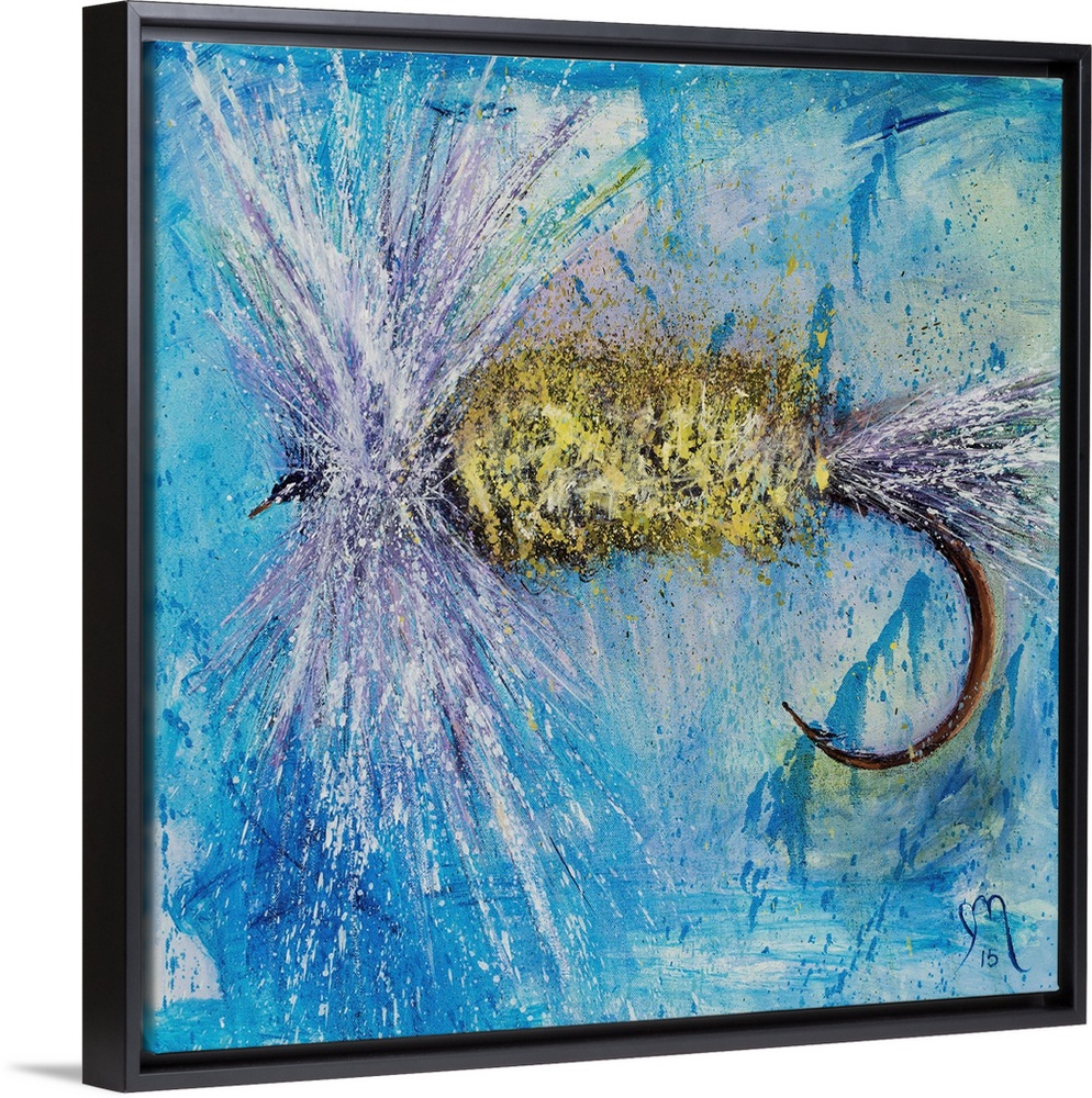 <p>Square painting of a purple, white, and yellow fly fishing lure on a blue and green background.</p>
