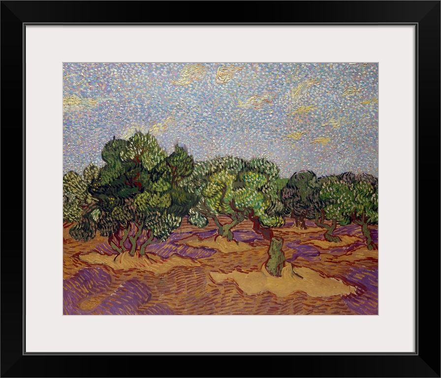 <p>This is one of five pictures of olive orchards that Van Gogh made in November 1889. Painted directly from nature but animated by Seurat-like stippling and stylized passages of broken color, these works responded to recent compositions by Paul Gauguin and Emile Bernard. What I've done is a rather harsh and coarse realism beside their abstractions, Van Gogh observed, but it will nevertheless impart a rustic note, and will smell of the soil.</p>