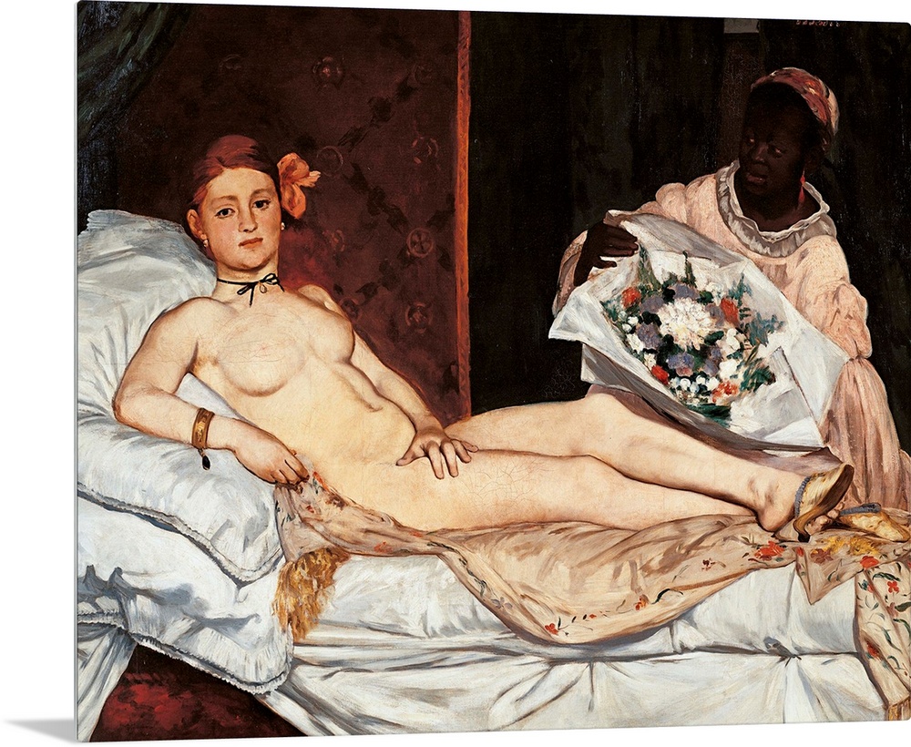<p>Olympia, by Edouard Manet, 1863, 19th Century, oil on canvas, cm 130,5 x 190 - France, Ile de France, Paris, Muse dOrsay. Detail. Bed pillows white flower red bunch negro housekeeper young lady naked armlet curtain. (109991) Everett Collection\Mondadori P</p>