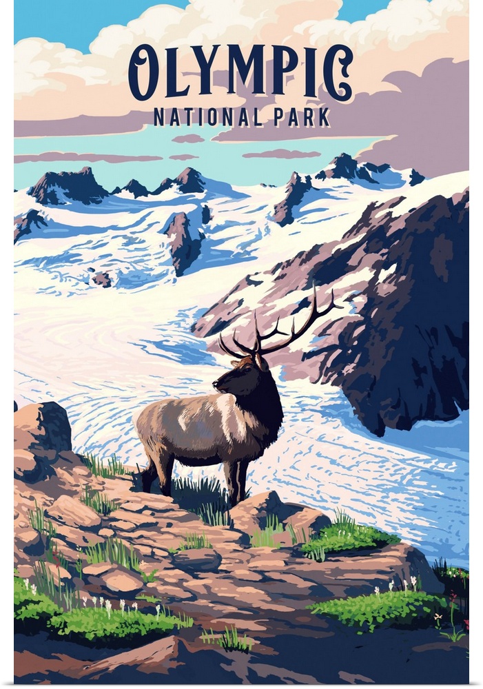 Art Mountains Lantern Press United States Olympic National Park Wildlife Moose and Elk