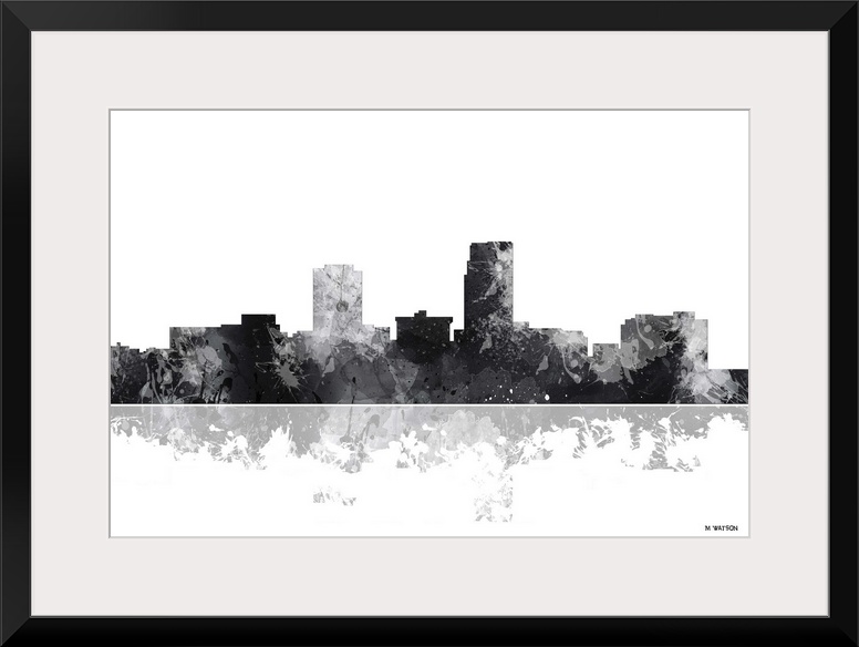 <p>Contemporary black and white watercolor skyline casting a mirror-like reflection below.</p>
