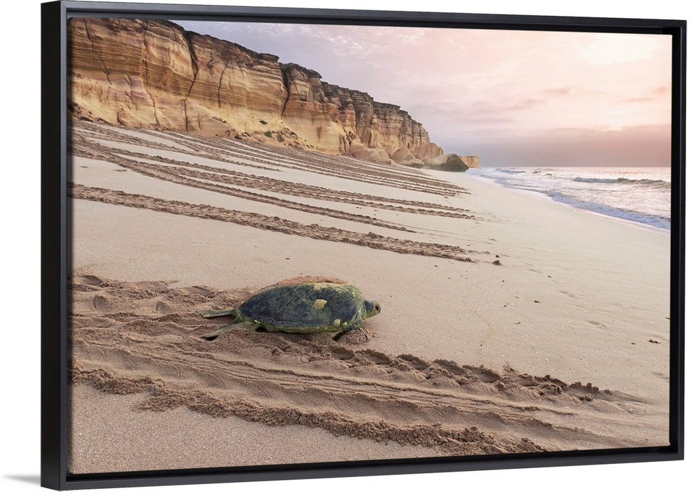 <p>Oman, Al-Sharqiyah, Sur, Ras al-Jinz Turtle Reserve, an endangered green turtle at the beach in the easternmost point of the Arabian peninsula.</p>