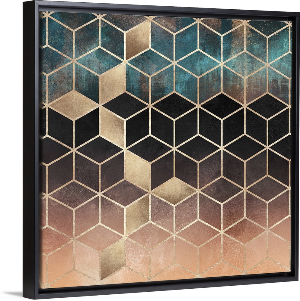 <p>A prism of triangles in various shades of textured teal, brown and peach are arranged in to form a three-dimensional prism effect. The triangles are outlined in gold.</p>