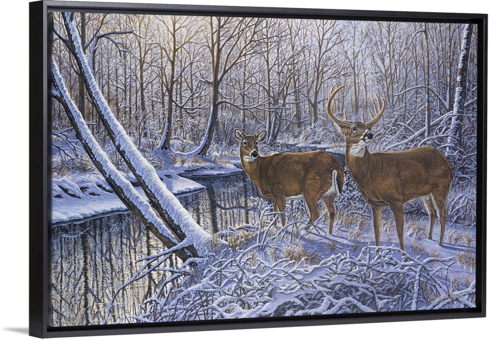 <p>Contemporary artwork of two white tail deer about to drink from stream in wintery forest but turned around because they heard a noise.</p>