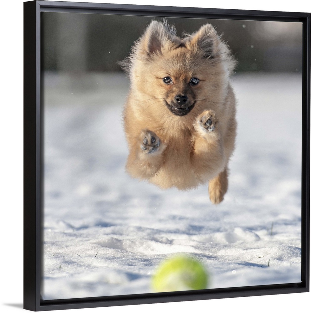 <p>A dog leaps through the snow after a tennis ball.</p>