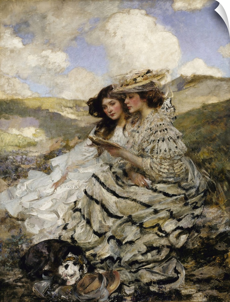 <p>Painting of female figures (Lady Nora Ward Shannon and Kitty Shannon) on the sand dunes with a bulldog in summer.</p>