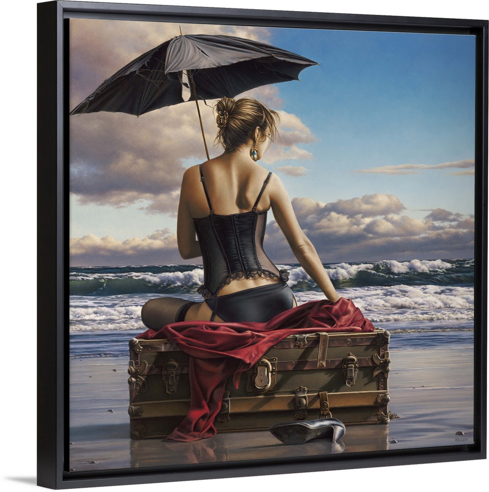 <p>Contemporary painting of a woman wearing lingerie and holding an umbrella, while sitting on luggage on the beach.</p>